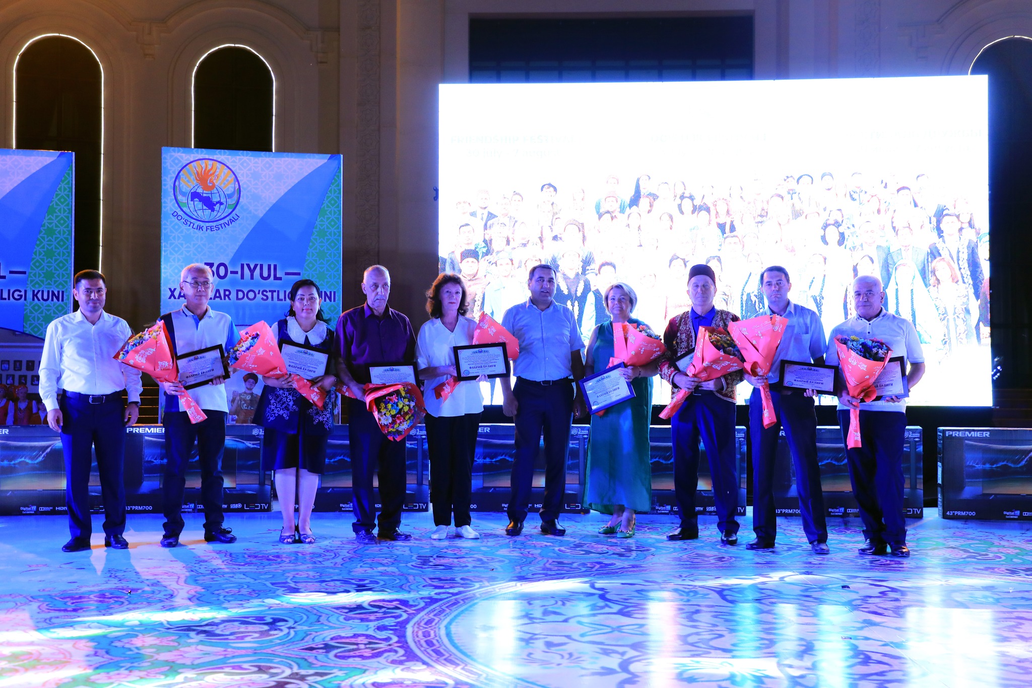 Шундан сўнг вилоятда фаолият олиб бораётган корейс, тожик, яхудий, турк, қирғиз, немис, татар, славян миллий маданий марказлари раҳбарлари байрам муносабати билан вилоят ҳокимининг фахрий ёрлиқ, эсдалик совғалари билан тақдирландилар.