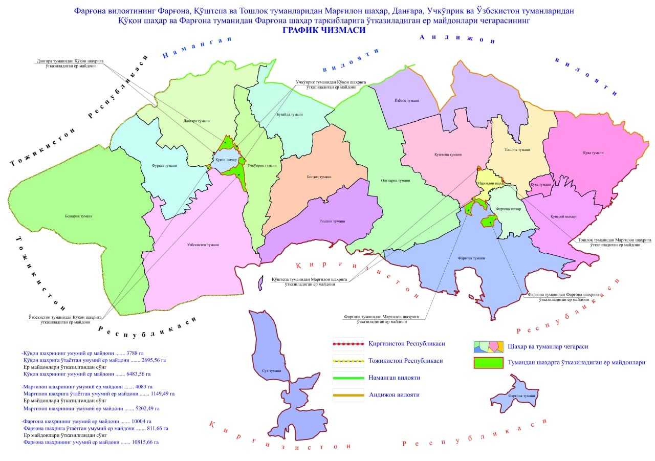 Ушбу қарор лойиҳасига кўра, Фарғона вилоятининг шаҳар ва туманларидаги чегараларини мувофиқлаштириш мақсадида шаҳарларнинг ривожланиш концепциясига мувофиқ: