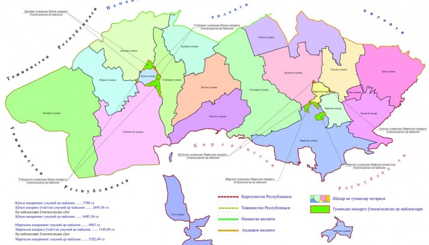 Чегаралари ўзгараётган туман ва шаҳарлар ҳудудларининг чегаралари бўйича, Фарғона вилояти ҳокимлиги, туман ва шаҳар ҳокимликлари таклифлари асосида Давлат солиқ қўмитаси ҳузуридаги Кадастр агентлиги томонидан биргаликда ҳужжатлар тўплами тайёрланди.